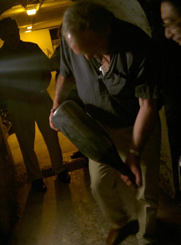 動瓶(ルミアージュ)を見せてくれました。こうやって瓶口に澱を集めます。