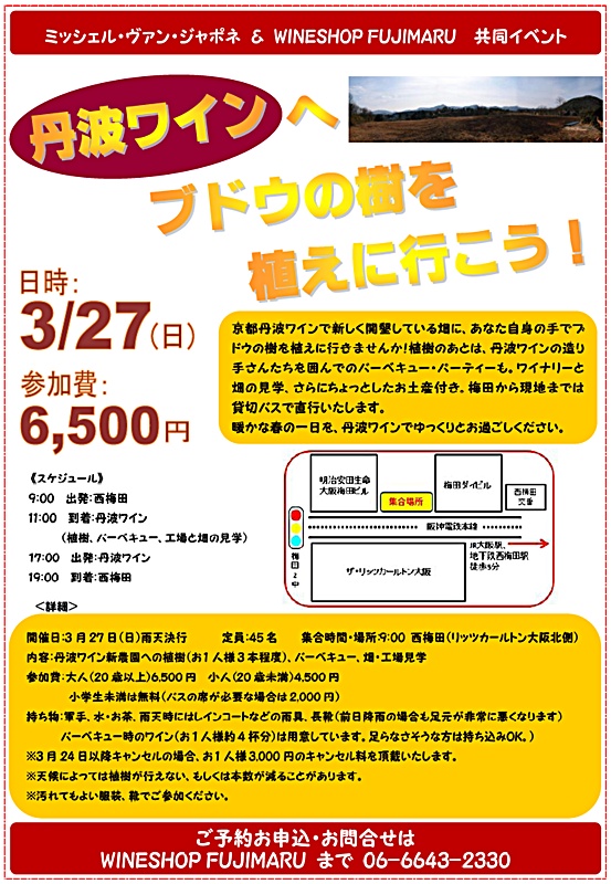 内容:丹波ワイン新農園への植樹(お1人様3本程度)、バーベキュー、畑・工場見学