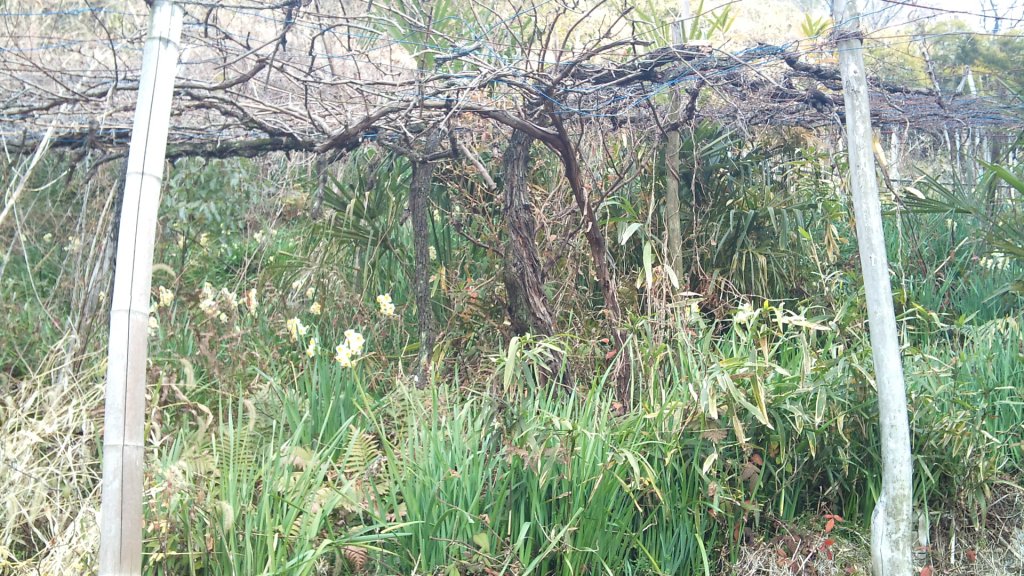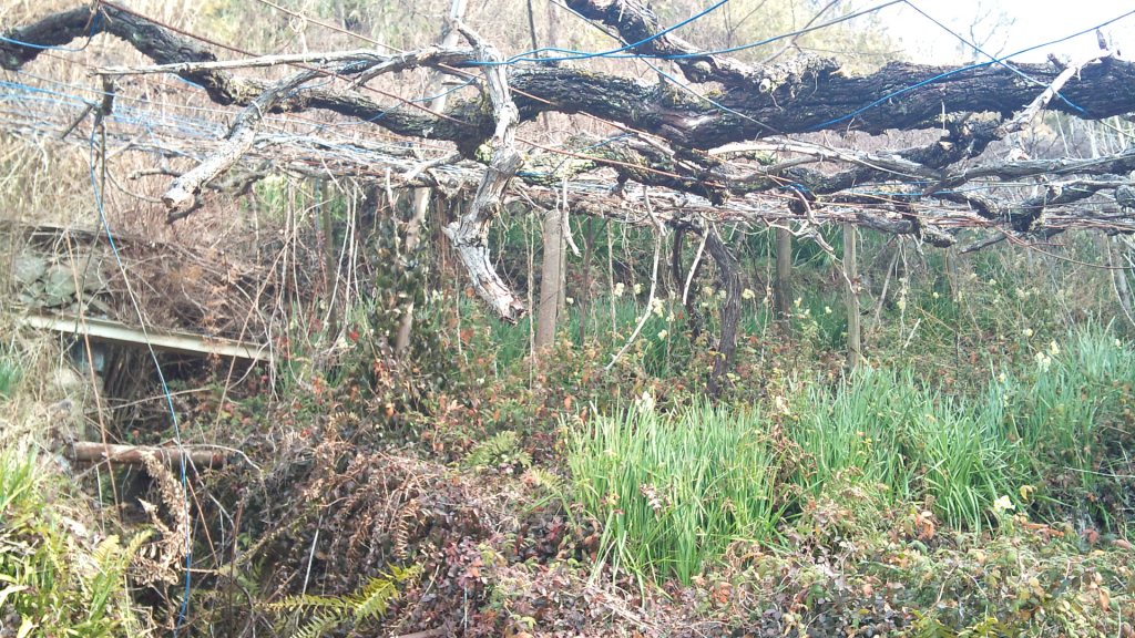 栽培放棄された棚仕立てのぶどう畑を