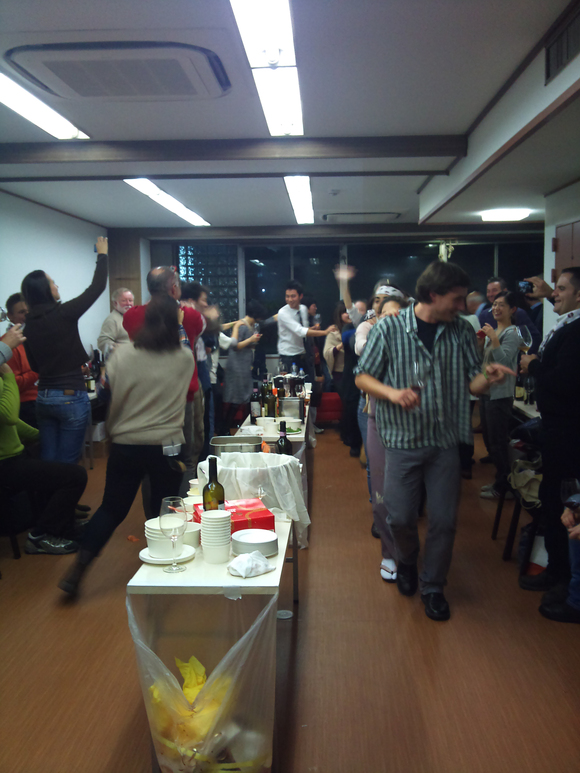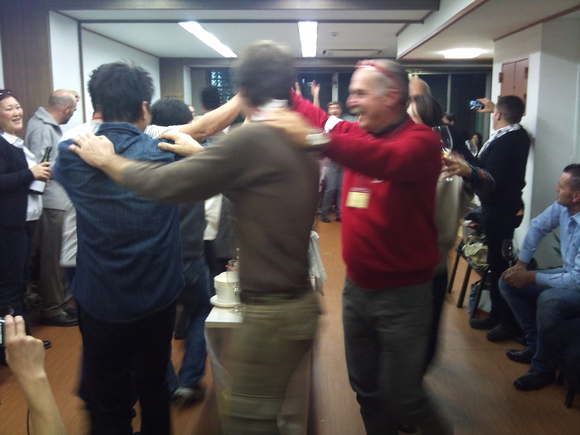 会が始まっていきなりイタリア人たちが食事のブースに並んだあたりは
