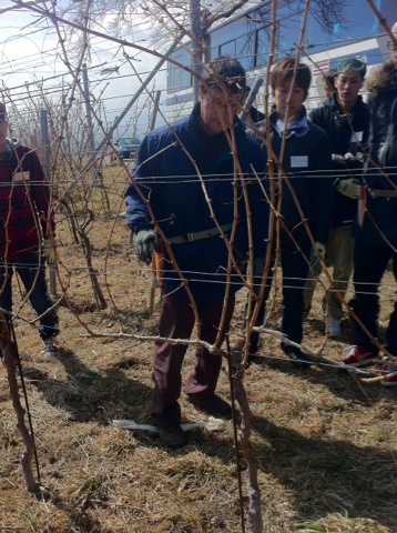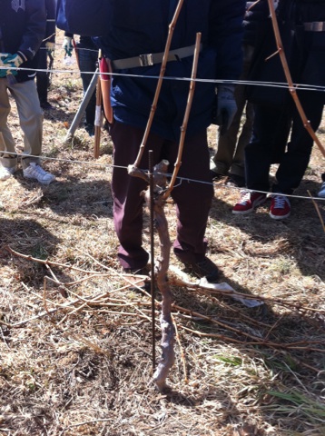 残す枝がまた、悩むんです。片方の枝に新芽を5つずつ残すんですが、1株から計10芽、この畑では一株あたり5L、ボトル約7本弱のワイン量となるわけです。