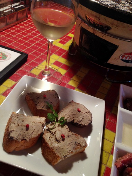 肝パテブルスケッタを口中に放り込み、そこへ赤ワインを満たしてあげると、