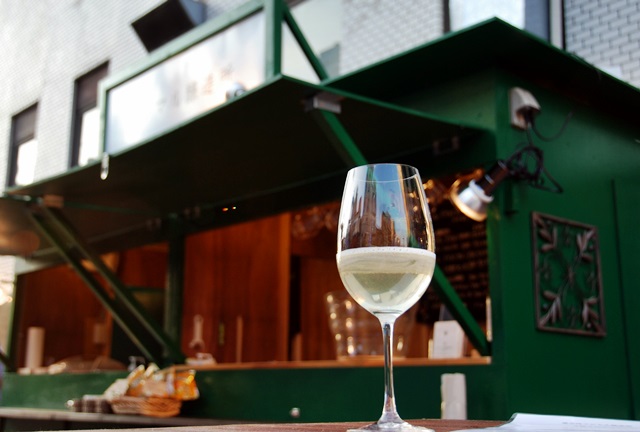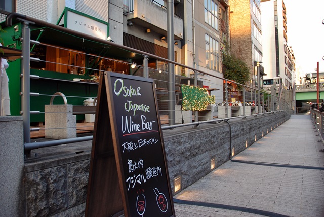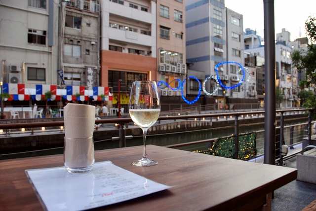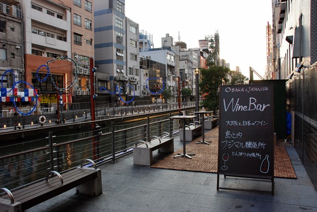 大阪の観光名所・道頓堀の川べりで、大阪産のワインを一杯。