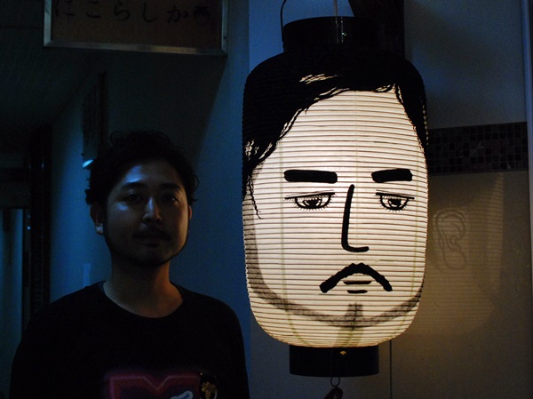 「お好み・葡萄酒 にこらしか」店主若江さんの顔を模したこの提灯が、