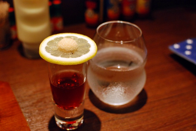 ブランデーにカットレモンと砂糖をのせ、口の中であわせながら