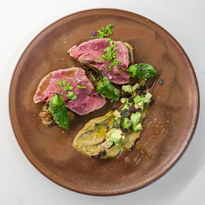 「牛フィレ肉のたたき 諸井醸造さんのしょっつる風味・ピスタチオのソース」