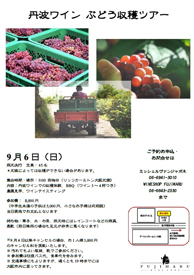 内容:丹波ワインでの収穫体験、BBQ(ワイン3~4杯つき)、