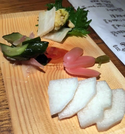 お漬物盛合せでクールダウンを図りながらも、焼けぼっくいに火。