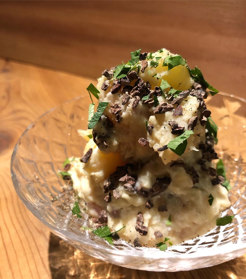 そこに、レーズン、ベーコン、玉ねぎを加え、上からはカカオニブをまぶし、味に深みをプラスしています。