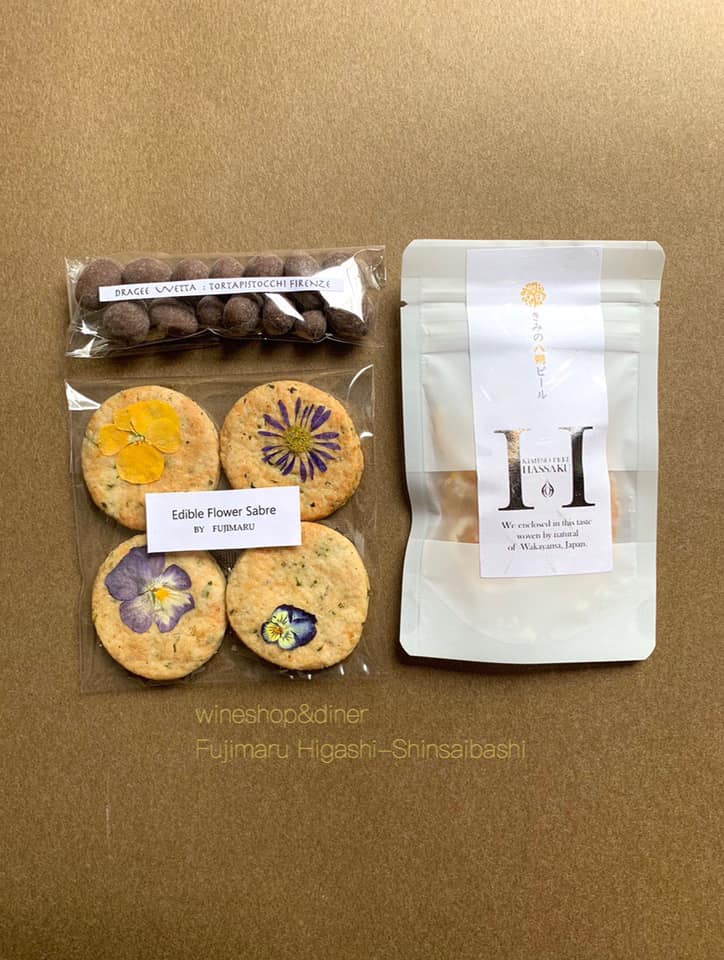 FUJIMARU特製、エディブルフラワーを使った、チーズと自家栽培・無農薬ミントのサブレの3点セットのアソート。