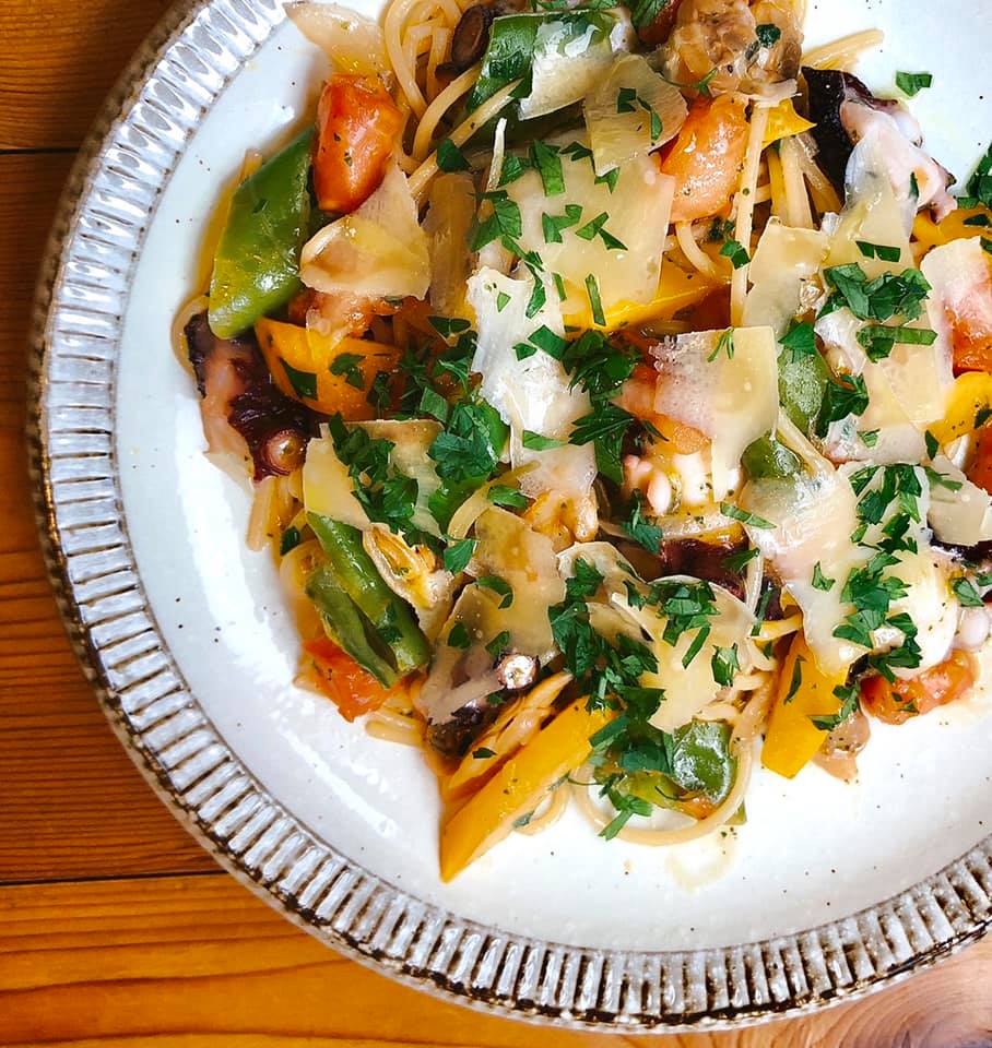 ぷりぷりの明石蛸と浅利をエスカルゴバターでソテーし甘長唐辛子を合わせたパスタ。