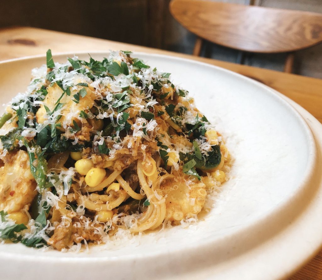猪の旨味たっぷり!とうもろこしの甘み、ツルムラサキの苦味のバランス感。旬の食材はやっぱり美味しいですね