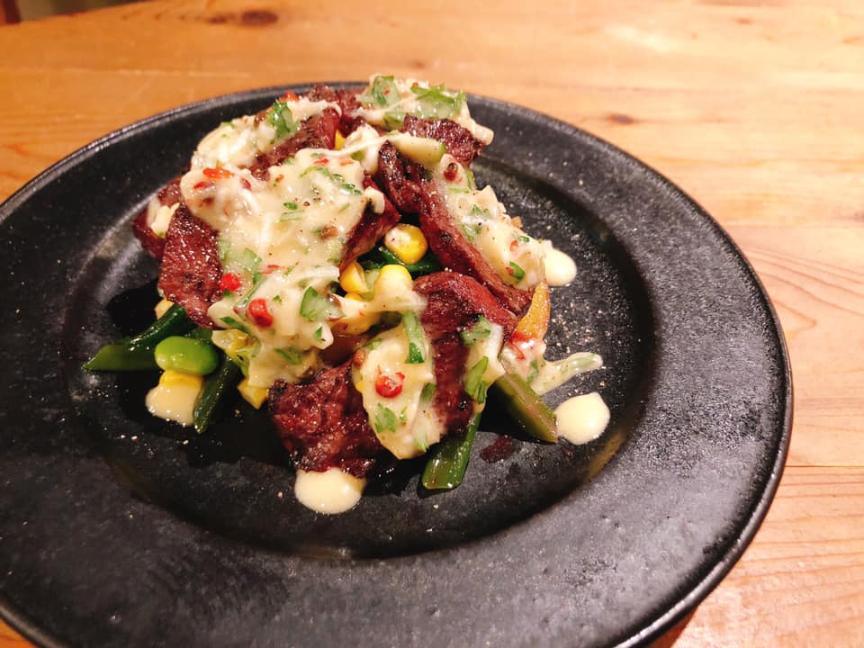 “都萬牛ハツと蔓紫、トウモロコシ、オクラの温製サラダ仕立て”