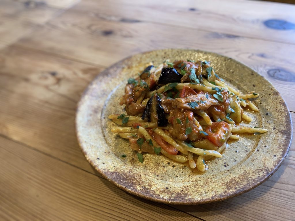 揚げてトロっとした大阪千両なす。ねじったパスタにソースが絡みます😋