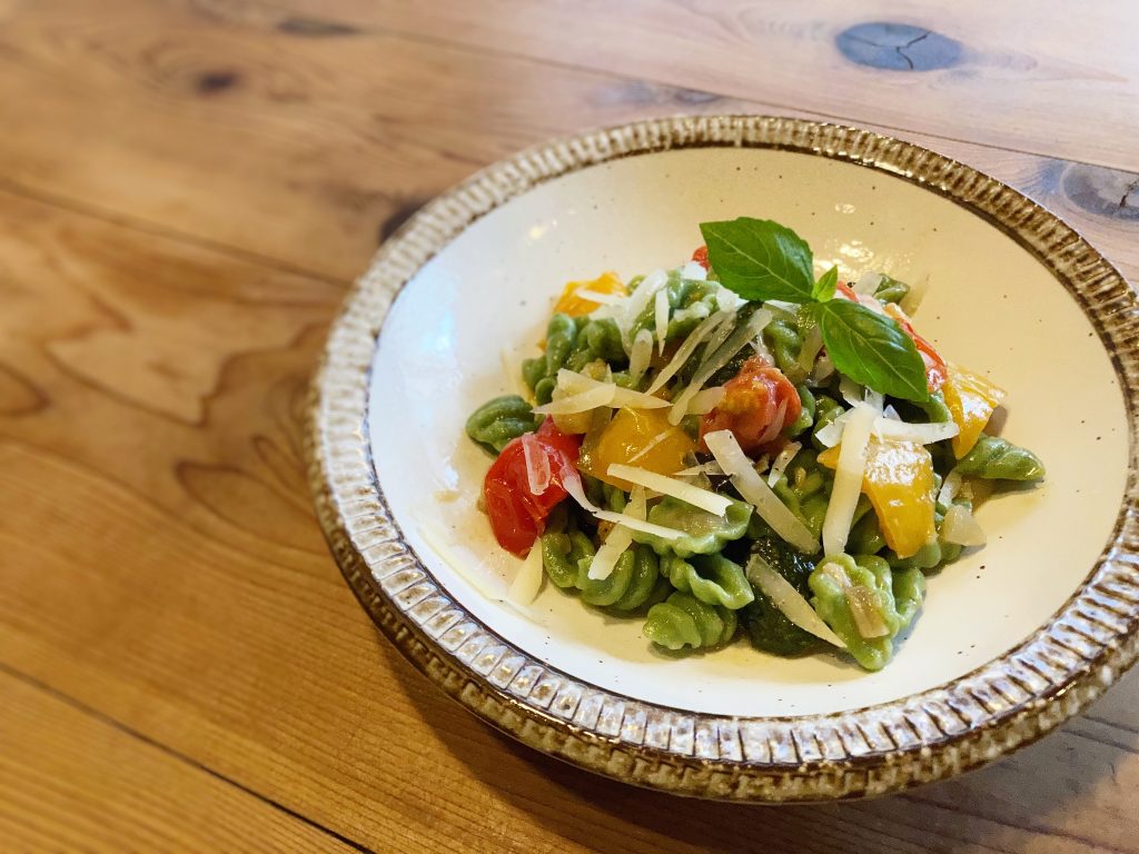 バジルを練り込んだコンキリエ トロトロ夏野菜のソース 白糠酪恵舎さんのチーズと