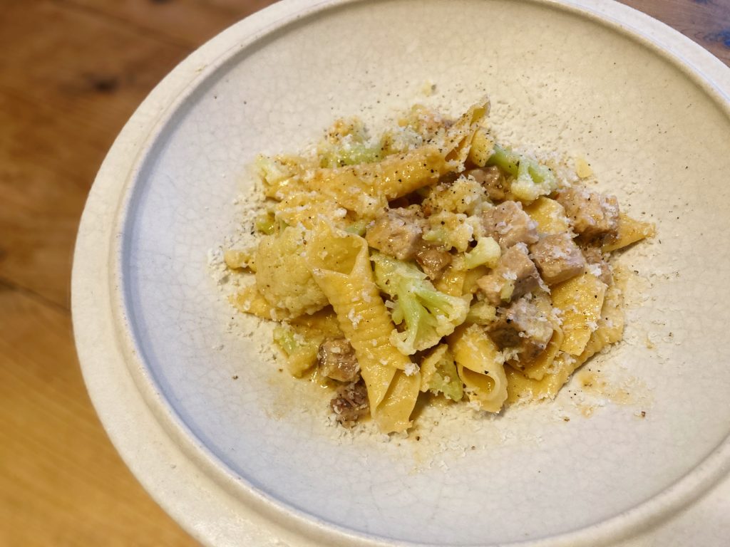 “ガルガネッリ 栗きん豚のばら肉の煮込みとカリフラワーのクリーム”