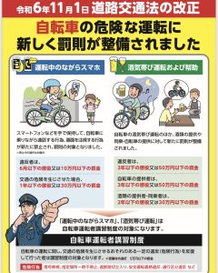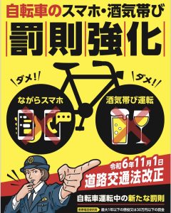 2024年11月1日より道路交通法の一部を改正する法律が施行され、自転車の運転中における携帯電話使用等(いわゆる「ながら運転」)及び自転車の酒気帯び運転等の罰則規定が整備されます。