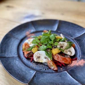 美しいサーモンピンクの身と深い甘みが特徴の”富士山サーモン”を発酵柚子や白ワイン等でマリネして、ビーツと人参のラペ、マッシュームやディル、ペリーラ、黒胡麻を使ったバーニャカウダソースを合わせて、様々な要素が盛り込まれた見た目も華やかな一皿に仕上がりました。