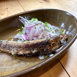 『イワシの炭火焼き 赤玉ねぎとコリアンダーのサラダ仕立て』