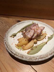 豚肉は表面をカリッと、中はジューシーに焼き上げ、春の旬食材”そら豆”を使ったペーストのソースと、ピンクペッパーをアクセントに華やかに仕上げた一皿です。