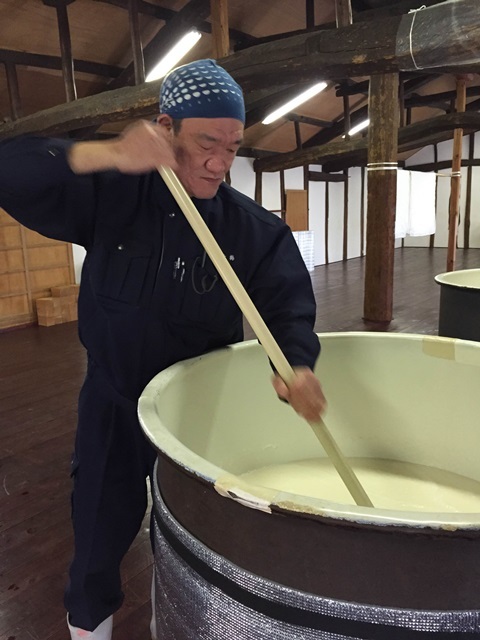 生酛造りは、蒸したお米を専用の櫂(かい)で摺り合わせながら自然な乳酸発酵を促す酛(もと)を造ります。