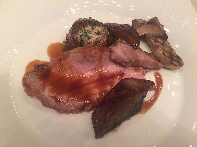 放牧豚18ケ月の骨付きロースト、内臓のソーセージと舌の煮込み添え