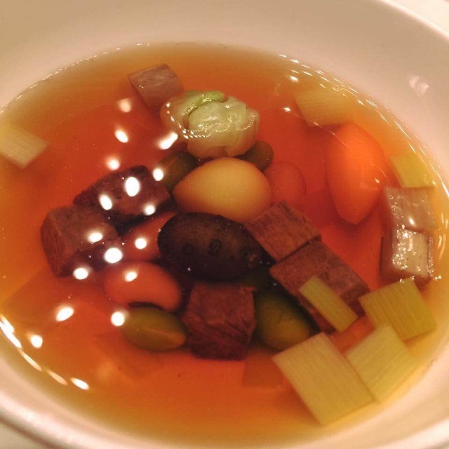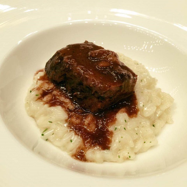 奈良イルンガ堀江シェフの短角牛の赤ワイン煮込みとゴルゴンゾーラ、ニンニクのリゾット