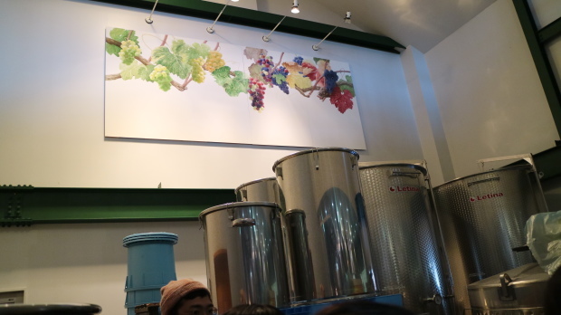 オーナー玉村さんのブドウの絵がワイナリーに鎮座。
