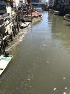 目の前の神田川に雨と風で舞い散った桜の花弁が!