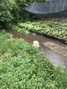 このわさび棚と同じ水で育てることで臭みがなくて美味しいあまごが生きる