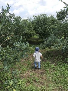 「ブルーベリーは赤くなってから青くなるんです。濃い色のもの、太陽がよく当たる上の方が甘くなるのでそこを狙ってね。」