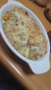 ⑦:茹でておいたペンネとジャガイモを耐熱皿にしき、出来上がった具材入りペシャメルを掛け、お好みでチーズをのせてオーブンへ。