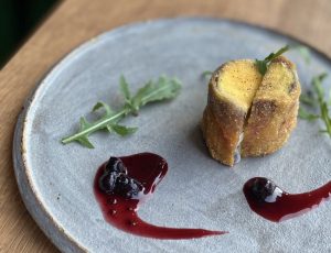 ” 山田農場のガロ(山羊チーズ)&茄子と生ハムのフリット ベリージャムソース “