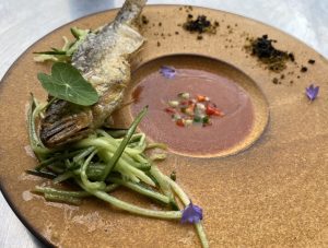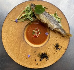 鮎のきれいで繊細な味わい、きゅうりのような爽やかな香りをより引き立てるためガスパチョスープを合わせました。