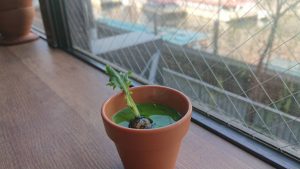 ・カウンターには飛沫感染対策で2席毎にアクリル衝立、並びに厨房との間にはビニールカーテンを設置