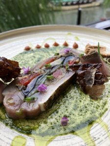 《 宮城県産 炙り〆金華サバ、茄子、トマトコンフィのプレッセ 3種のソース 》