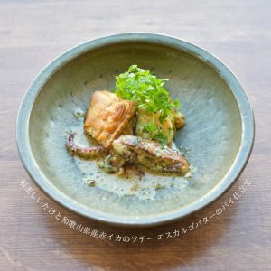 高温でしっかりと色を付けて焼き上げることで旨味をギュッて閉じ込めた福王しいたけと、和歌山県産のもっちりとした赤イカを風味豊かなエスカルゴバターで仲良くソテーに。