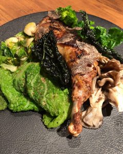 岩手県石黒農場さんより届いたホロホロ鶏もも肉を一度低温の油でコンフィし、表面をカリッとローストし旨味を閉じ込めた一品。