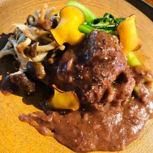 フォークでほろほろとほぐれるほどじっくり煮込んだ猪ほほ肉。アクセントにシェリー酒を加えてコクと旨味をプラス。