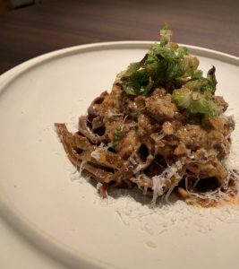 ゴロゴロと大きめにカットした椎茸の風味豊かな食べ応えのあるソースにカカオを練り込んだ自家製タリアテッレを合わせました。