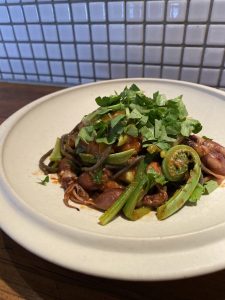 “イカ墨を練り込んだスパゲティ ホタルイカと山菜のトマトソース“