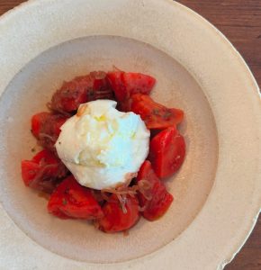 バルサミコと赤ワインビネガーを合わせたエシャロットのマリネでトマトを和えたシンプルな仕立て