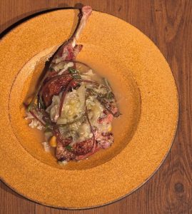 骨付きのほろほろ鳥もも肉を香味野菜や白ワイン、スパイスと共に柔らかくなるまで火入れし、仕上げに皮面をばりっと焼き上げました。