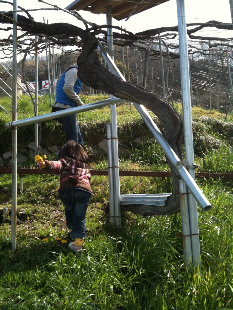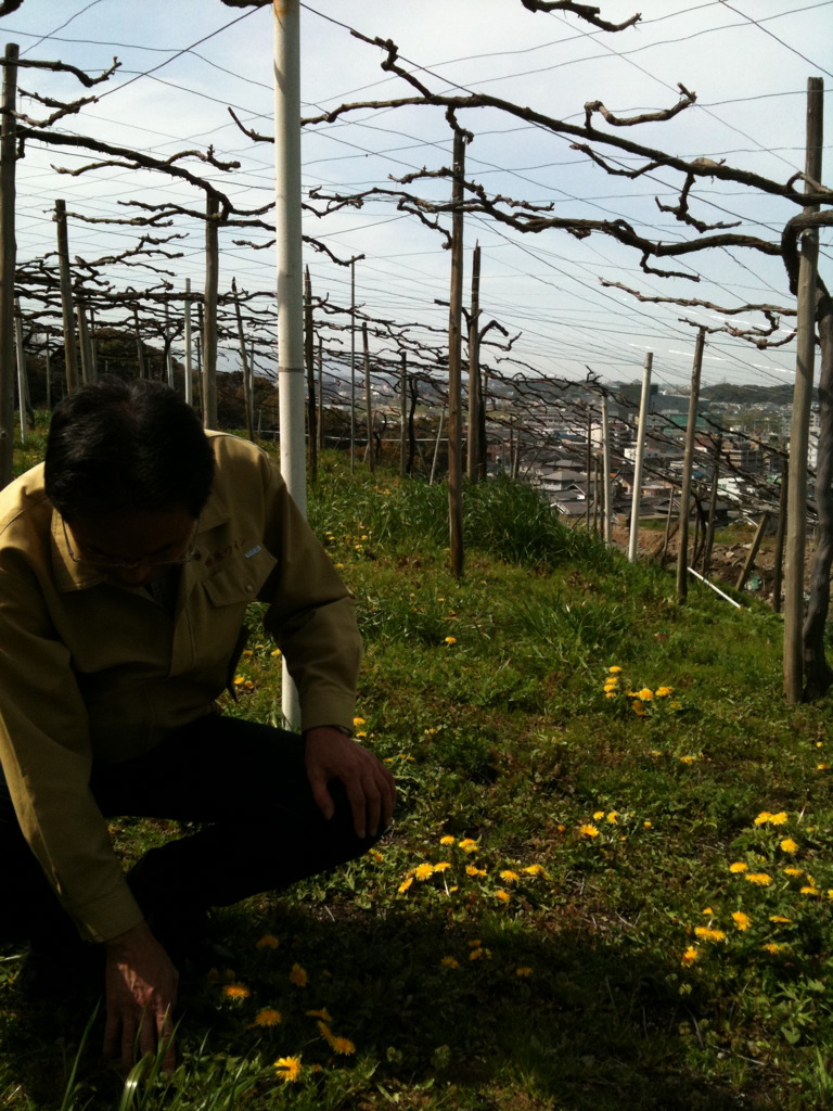 25年ほど前に高井さん自身が除草剤を散布中に病院に担ぎ込まれたことがある経験から畑での除草剤は使わず土を育てる事から始める。畑にはかなりの種類の植物が生息。剪定した枝を砕いたりブドウの搾りかすを畑にまき雑草などが生えにくくし、堆肥の代わりとして使用しています。