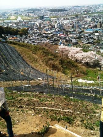斜度35度ほどの急斜面に垣根仕立てで植樹中。