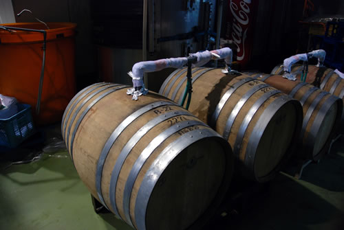 さっそく担当の榊さんに案内していただて、醸造設備を見させていただきます。きれいに手入れされたステンレスタンクやフィルターが並び、奥の方には発酵用の小樽も。温度管理を行うために、冷水を循環させるパイプ装置を手作りされるなど、苦労の跡がうかがえます。この醸造全般を取り仕切っているのが、メディアにもよく登場されている幸山さん。雑誌では長髪のお姿を見かけていたのですが、この日はきれいサッパリとした髪型でした!こちらの方が似合ってるかも・・(笑)