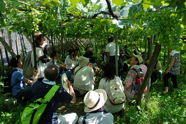 みなさん元気に畑のなかへ。棚仕立てのブドウ畑はちょうど日光を遮るかたちになり、