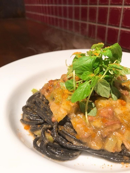 『スルメイカ煮とポワローネギのオイルソース イカスミスパゲッティー』