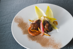 ⚫︎豚肉をカカオパウダーで漬け込む事によりシェリー酢の酸味に苦味が加わりコクと奥深さが生まれます。カルダモンドレッシングで和えたアンディーブのほろ苦さと瑞々しさ、人参の甘みを多彩なカカオの香りがまとめあげた一皿。