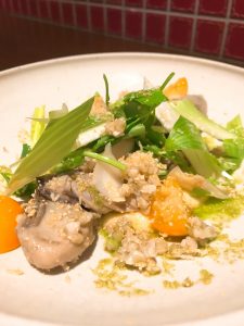 『牡蠣のオイル漬けとソバの実、金柑のサラダ カリフラワーのソース』